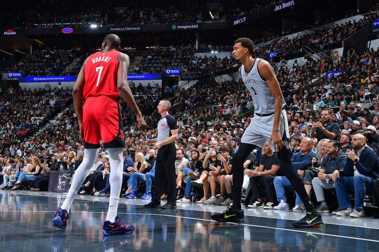 马刺鼓励火箭单挑,火箭首节三分5中2,默认杜兰特和申京单打,不让全队有行云流水的进攻,试图切割火箭全队的进攻。